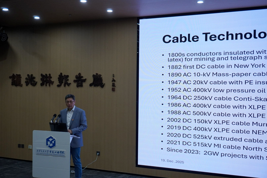 聘任仪式结束后,张冬平教授作了题为《Cable Engineering and Standards Development》的学术报告(电工材料电气绝缘全国重点实验室—电气之光大讲堂第四期)。报告系统介绍了国际电力电缆工程的发展现状与技术挑战,重点阐述了高压及超高压电缆在工程设计、运行可靠性以及国际标准制定方面的关键问题,并展望了未来电缆工程技术发展的趋势。张冬平教授会后与师生就电缆工程应用、标准差异及工程实践等问题进行了深入讨论。