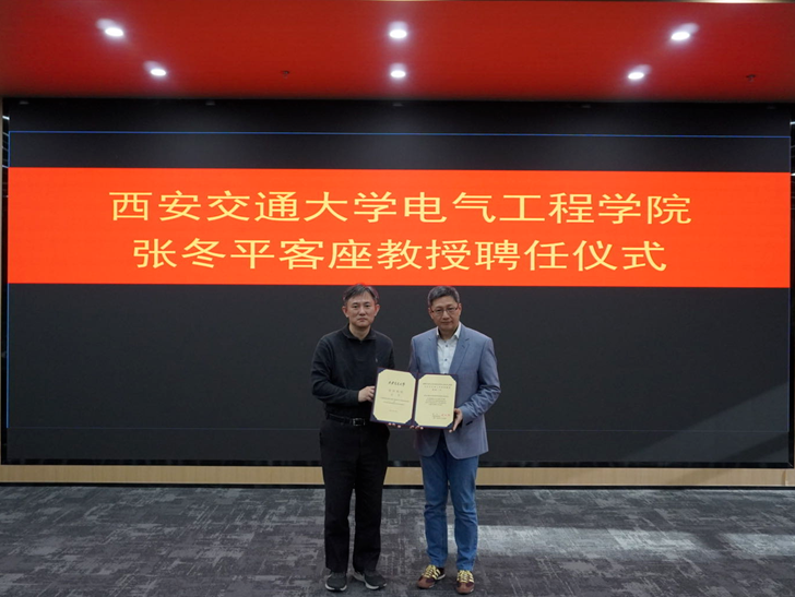 近日,德国TenneT公司高级工程师Roland Dongping Zhang(张冬平)受聘西安交通大学客座教授仪式在中部西部科技创新港躬行楼钟兆琳报告厅举行。西安交通大学电气工程学院院长杨旭为张冬平教授颁发聘书。