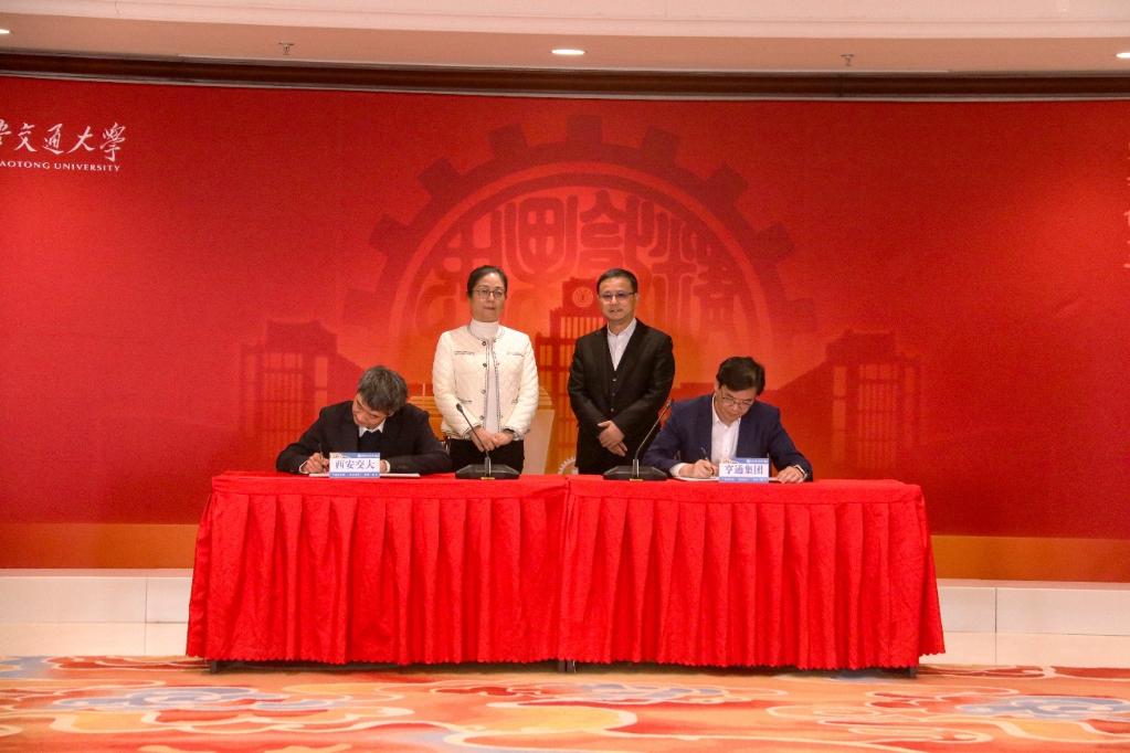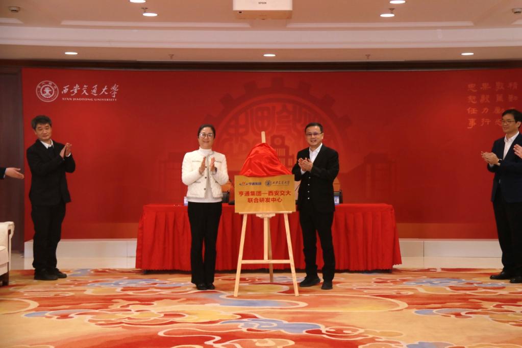 西安交通大学徐大锴与亨通集团钱志康签署合作协议,别朝红与钱建林共同为联合研发中心揭牌。